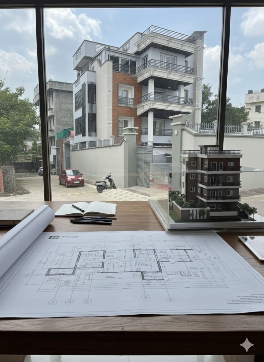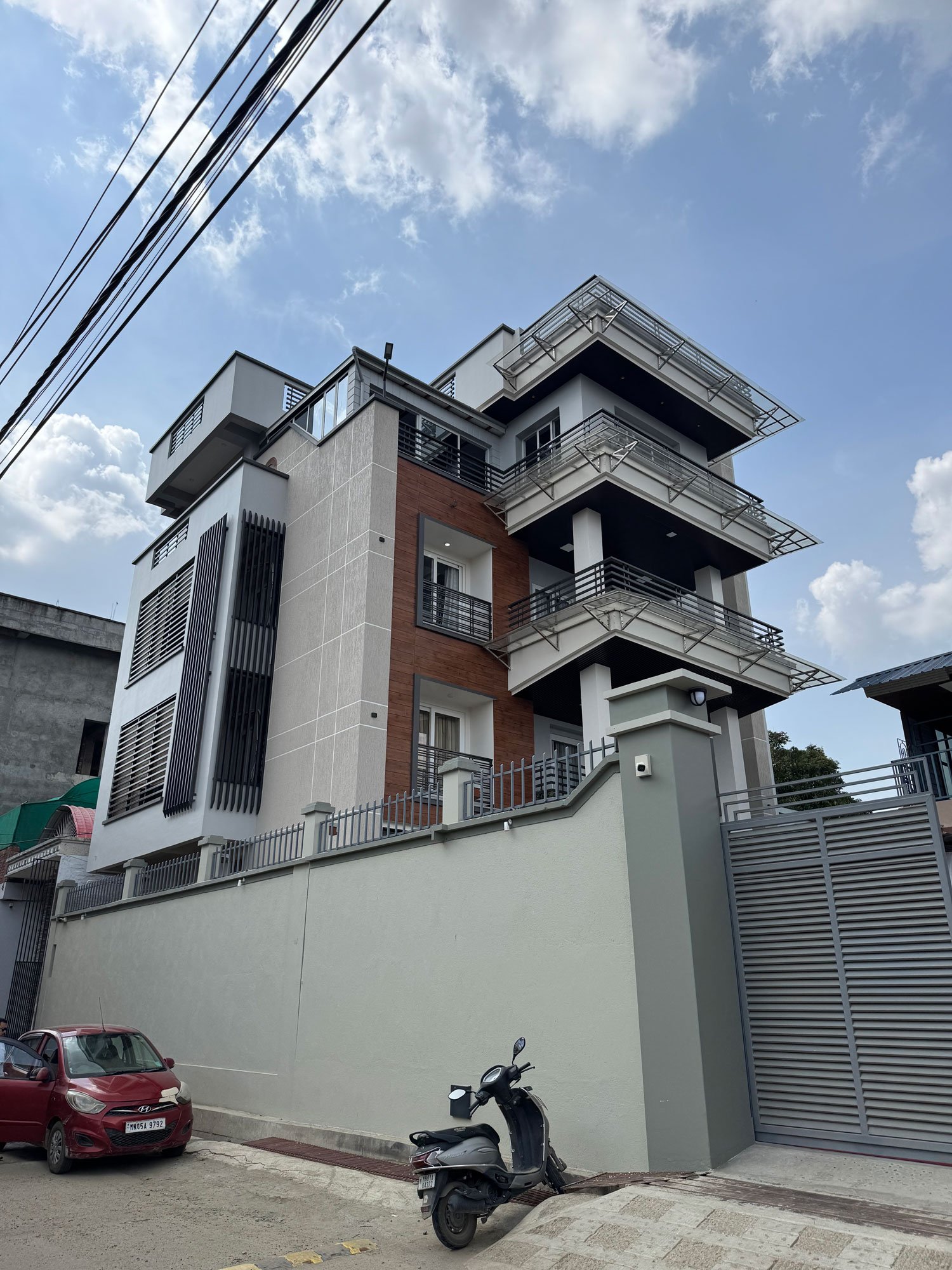 This residence stands as a testament to sophisticated modernist design, catering to the needs of urban living with its blend of aesthetics, security, and environmental responsiveness The building’s massing is distinctly modern, with bold layers and cantilevered balconies that create visual movement. The interplay of vertical and horizontal grillwork adds depth and shading, while maximizing ventilation and privacy.